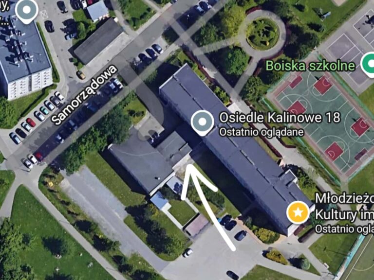 Wejście na sale gimnastyczną znajduję się po lewej stronie od parkingu. Na poniższym obrazku wejście jest zaznaczone białą strzałką.